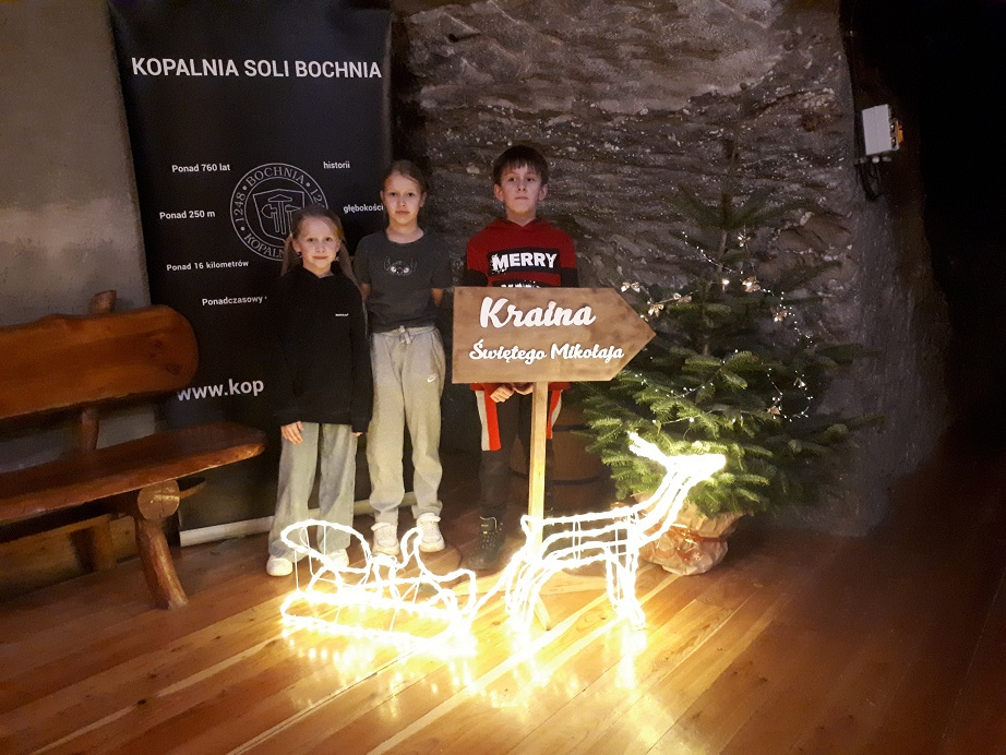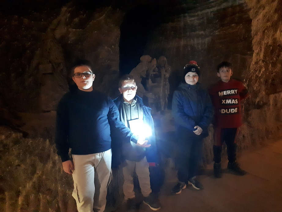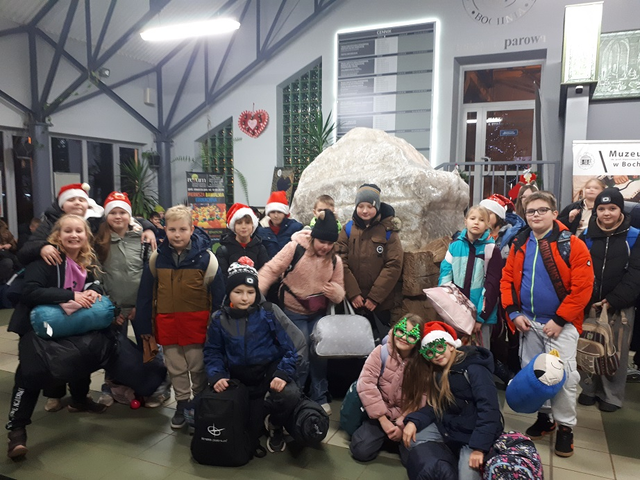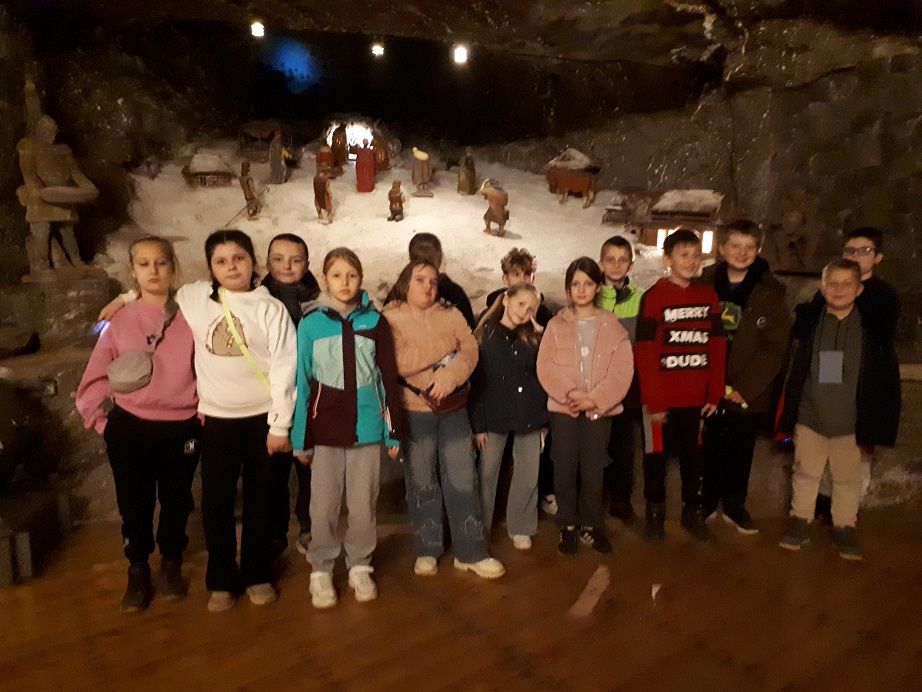 Uczniowie klasy czwartej i piątej wraz z opiekunami 8 grudnia pojechali do Kopalni Soli w Bochni. Pełni zaciekawienia zjechali windą górniczą pod ziemię na głębokość 250 m do najstarszej kopalni soli w Polsce. Przejechali się podziemną kolejką górniczą, przeszli trasę turystyczną z ekspozycją multimedialną poznając historię powstania kopalni oraz wzięli udział w podziemnej przeprawie łodzią po wodzie solankowej. Po czasie spędzonym na zwiedzaniu, uczniowie skorzystali z ciepłego posiłku. Następnie wzięli udział w zabawach integracyjnych w Komorze Ważyn, gdzie znajduje się boisko sportowe, plac zabaw i gry zręcznościowe. Uczestnicy wycieczki noc spędzili w kopalni, korzystając z dobroczynnego mikroklimatu. Wszyscy wrócili pełni wrażeń i wspomnień.