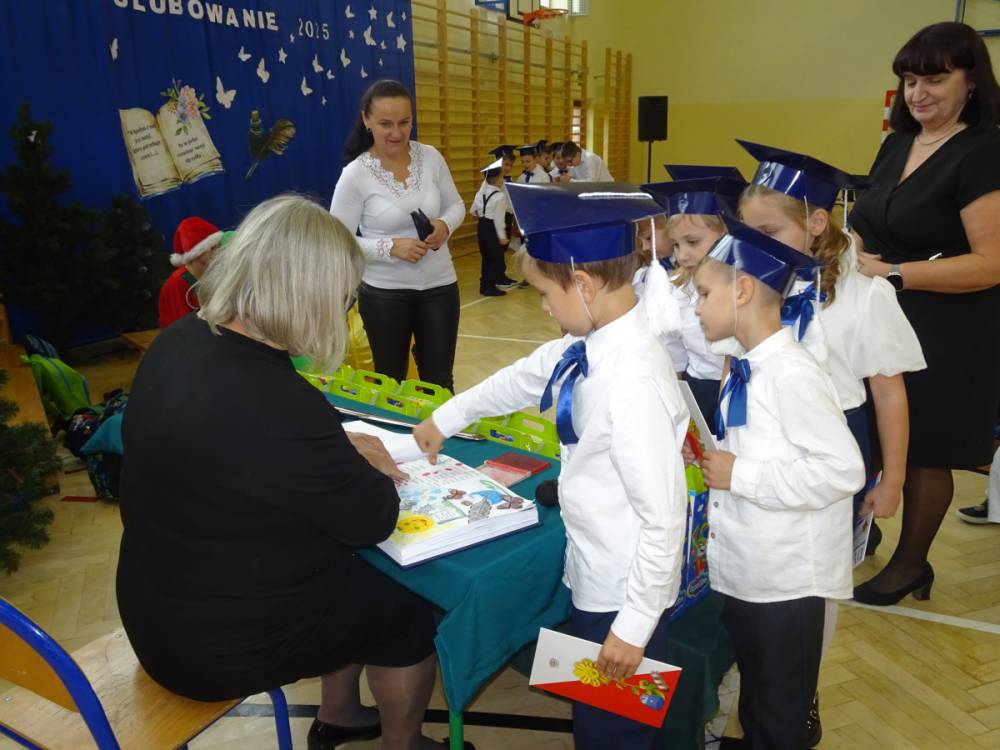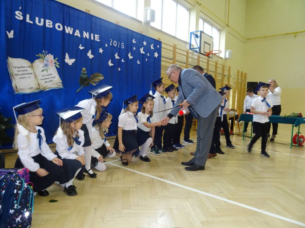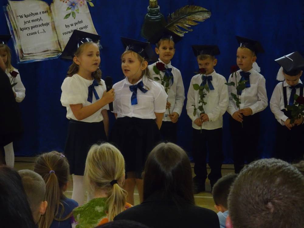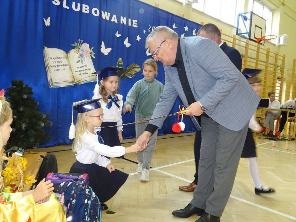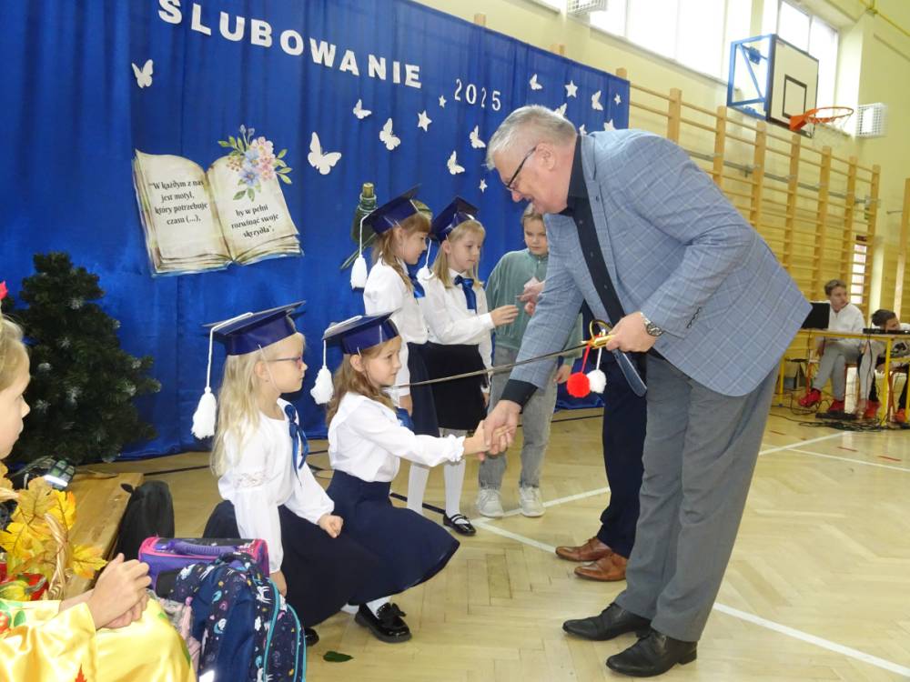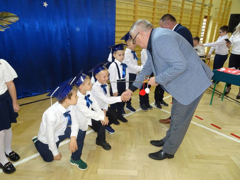 Następnie pan dyrektor Mieczysław Chabura historyczną szablą dokonał aktu pasowania uczniówi złożył im serdeczne życzenia. Radny Gminy Szczurowa pan Marek Łucarz wręczył dzieciom legitymacje szkolne, a wychowawczyni pamiątkowe dyplomy. Na zakończenie uczniowie otrzymali liczne prezenty: od Wójta Gminy Szczurowa Pana Zbigniewa Moskala, pani Anny Bajor, pana Marka Łucarza oraz od Rady Rodziców.