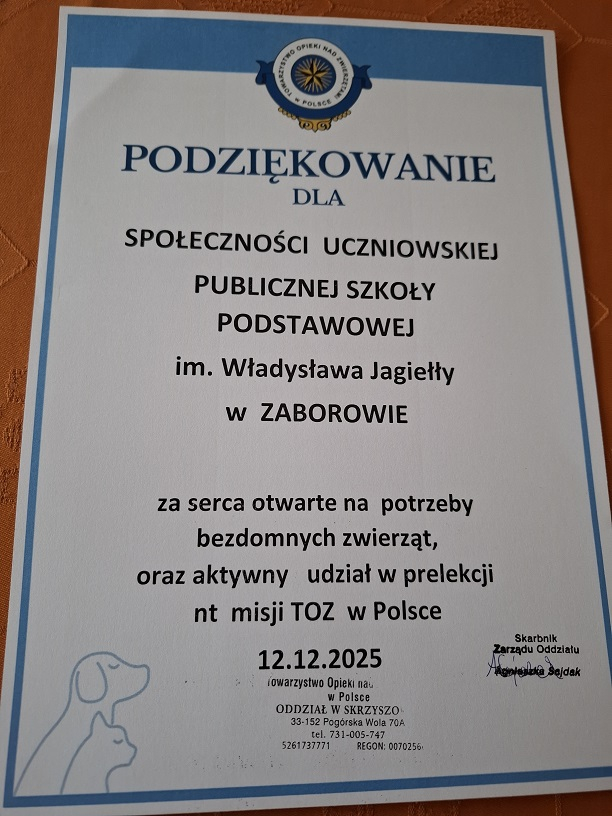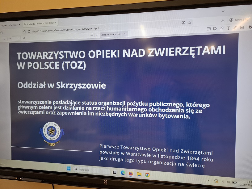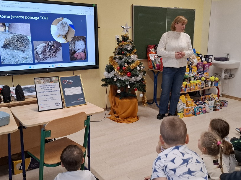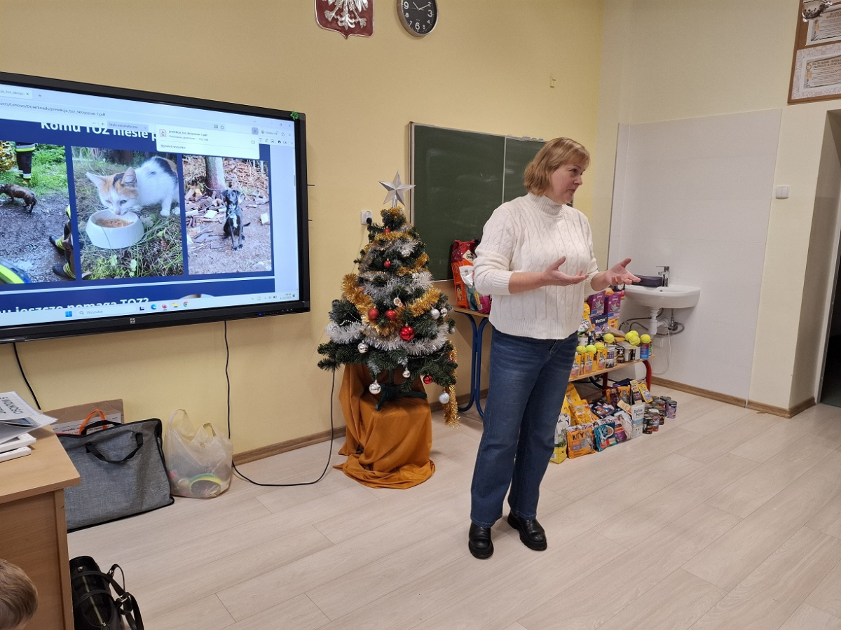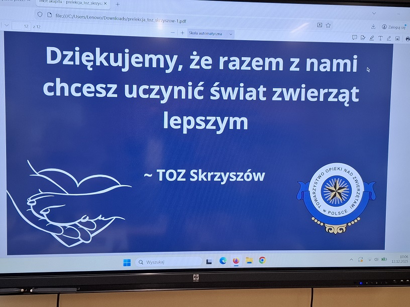Uczniowie naszej szkoły w dniu 12 grudnia wzięli udział w spotkaniu z panią Agnieszką Sajdak, która jest wolontariuszem Towarzystwa Opieki nad Zwierzętami w Tarnowie, odział Skrzyszów. W dwóch grupach dla młodszych i starszych uczniów wysłuchali prelekcji dotyczącej zakresu działań TOZ-ów (od dokarmiania i leczenia potrzebujących tego zwierząt, otaczania ich opieką, szukania dla nich domów tymczasowych aż do adopcji), pełnej ważnych informacji o prawidłowej opiece nad zwierzętami a także ciekawostek i wiadomości z życia zwierząt i to nie tylko domowych. Uczestnicy mogli obejrzeć prezentacje, przygotowane zdjęcia, materiały a także sprzęt do czipowania zwierząt czy akcesoria niezbędne w naszych domach dla kotów i psów. Była też możliwość zadawania pytań, podzielenia się swoimi historiami związanymi ze zwierzakami oraz udziału w tematycznym quizie. Na koniec została przekazana zebrana w naszej szkole karma, za którą otrzymaliśmy piękne podziękowanie. Wystarczy wspomnieć, że już jedna mała saszetka karmy pozwala kotu przeżyć kolejny dzień.Spotkanie było pełne wzruszeń a jego uczestnicy powinni zapamiętać przekazane im wiadomości iwskazówki oraz zawsze się do nich stosować. Organizatorem spotkania była pani Grażyna Antosz.